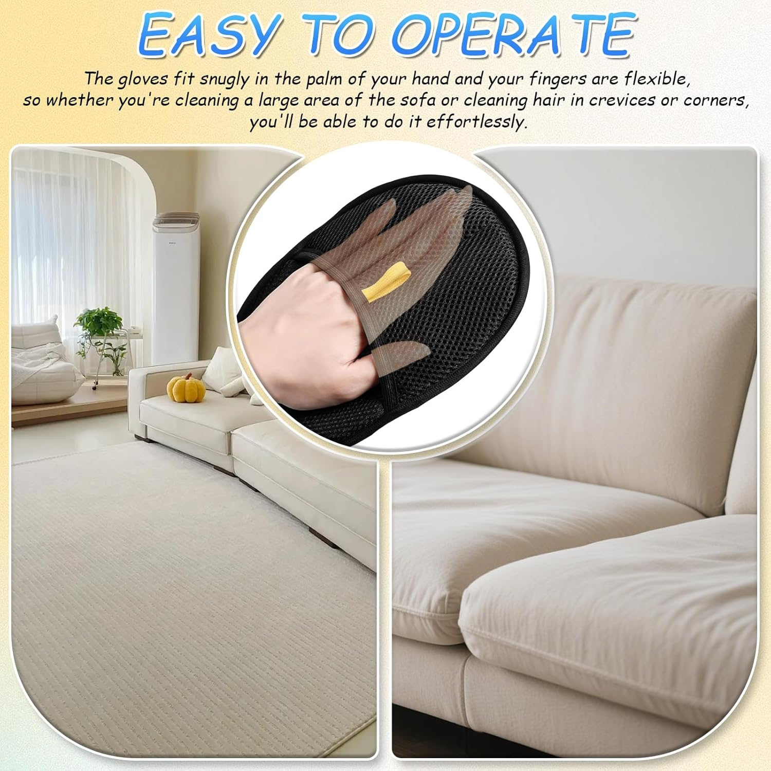 - EASY TO OPERATE: The gloves fit snugly in the palm of your hand and your fingers are flexible, so whether you're cleaning a large area of the sofa or cleaning hair in crevices or corners, you'll be able to do it effortlessly.